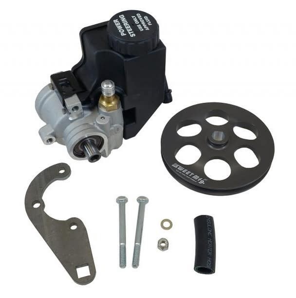 240/300 Ford Power Steering Add-on kit includes power steering pump with reservoir and -6 AN fitting, power steering pulley, power steering adjustment bracket and installation hardware.