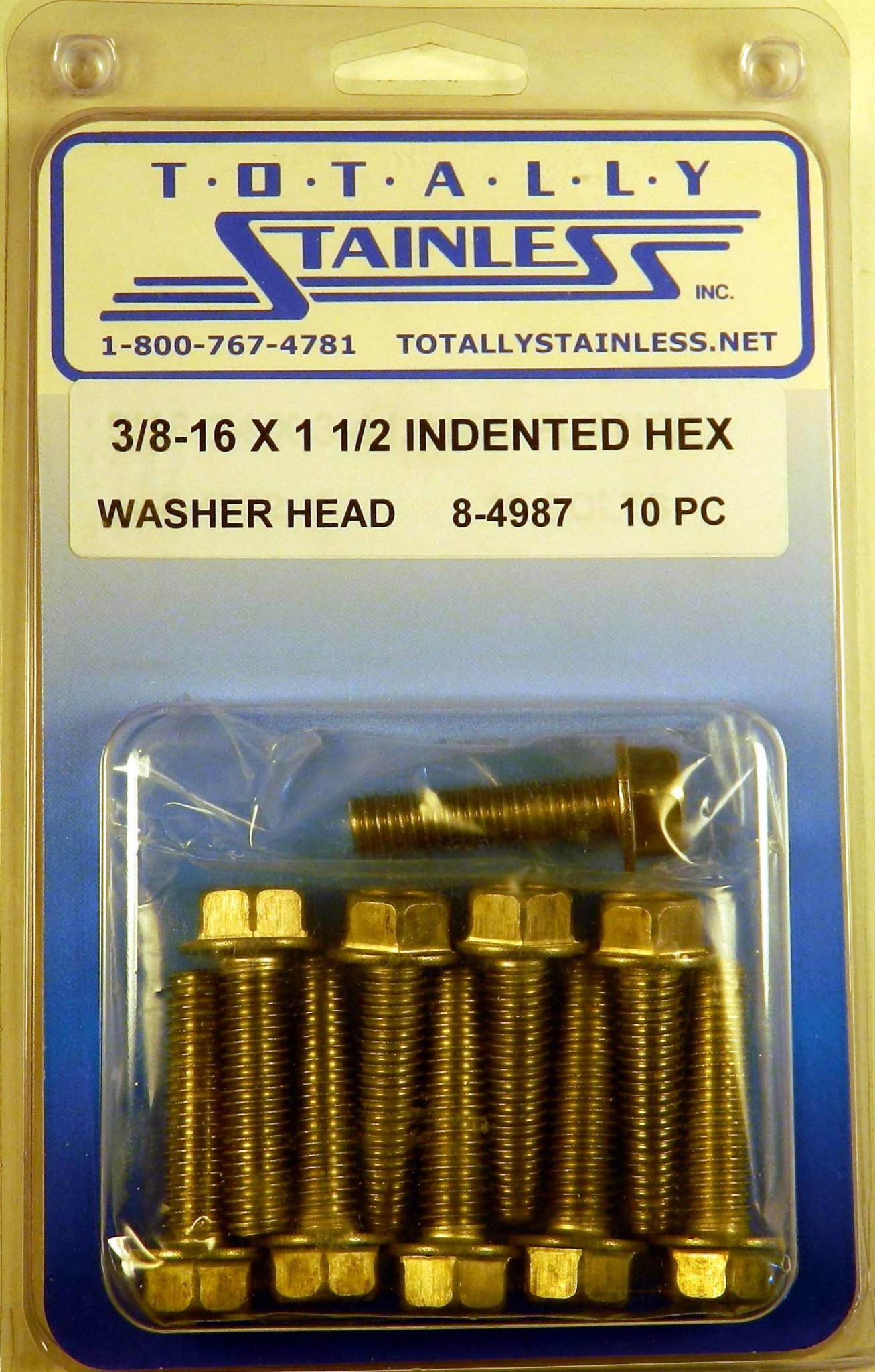 Genuine Totally Stainless 3/8-16 x 1-1/2" Stainless Indented Hex Washer Head Bolts - 8-4987 - 18-8 Stainless Steel - 10 Bolts