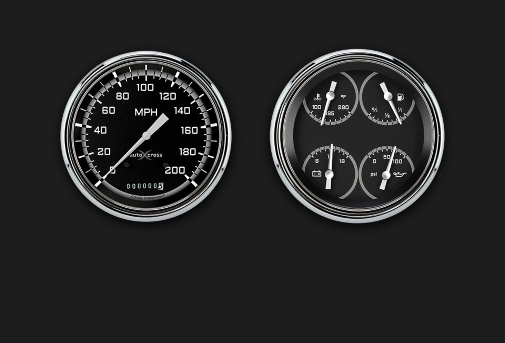 1947-53 Chevy/GMC Truck Packages features a 4 5/8" Speedometer with Info Screen and Quad (Fuel, Oil, Temp, Volt combination gauge) with stainless low step bezels and flat glass lenses.