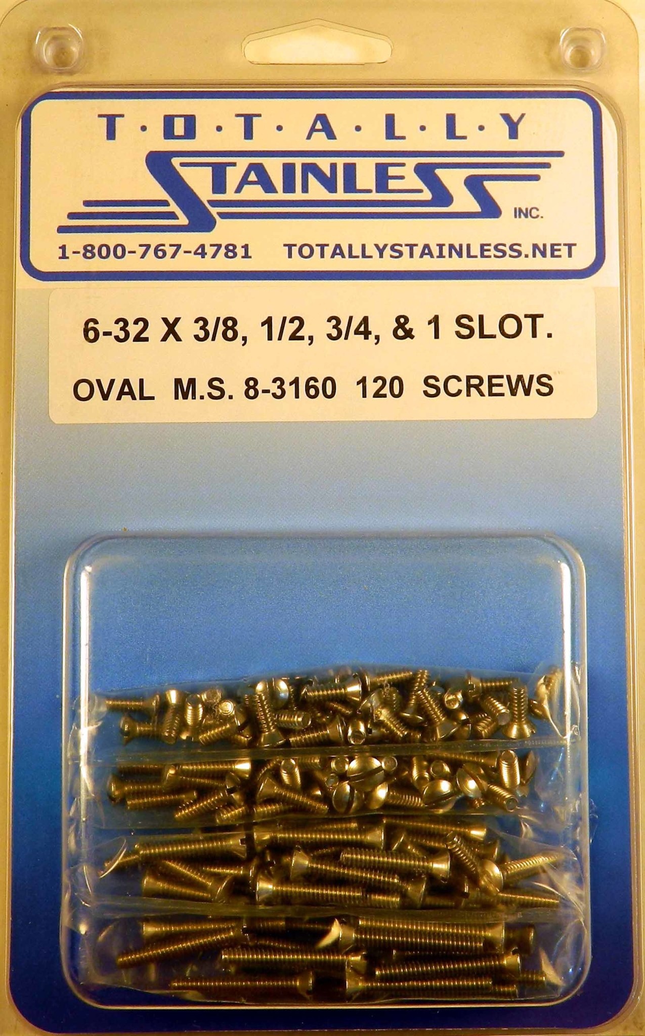 Genuine Totally Stainless #6-32 x 3/8", 1/2", 3/4", & 1" Stainless Slotted Oval Head Machine Screws - 8-3160 - 18-8 Stainless Steel - 120 Screws