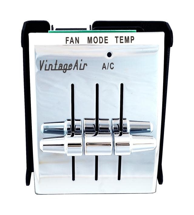 Bolt-in replacement control panel designed for Gen IV and Gen 5 systems. Machined from 6061-T6 billet aluminum, then triple chrome plated with laser etched lettering. Features include LED “A/C on” indicator and variable slide adjustments for fan speed, temperature, and air delivery selection. Installs in OEM dash location with included hardware.