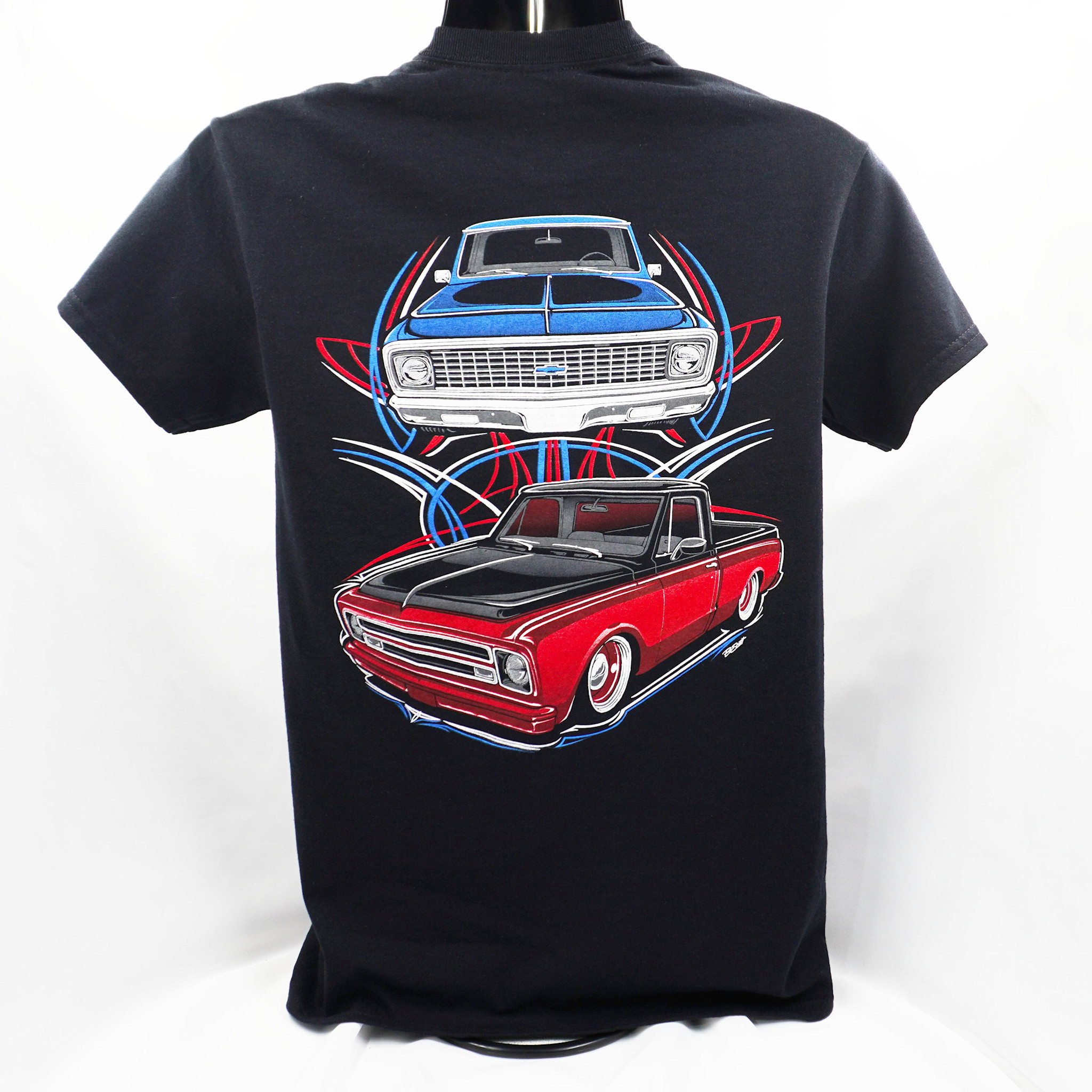 The back design sports two cool C-10 trucks in red and blue with pinstripe accents.