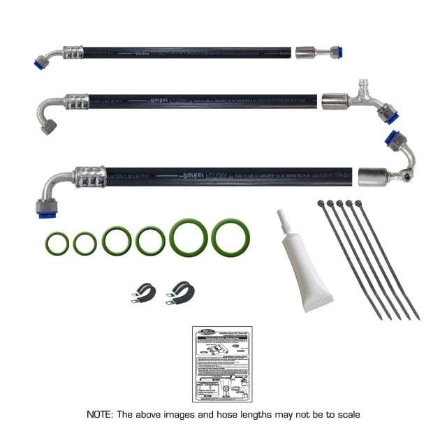 This modified hose kit is designed for use with a complete Gen IV SureFit™ system in vehicles without a stock engine compartment configuration and core support. The kit contains refrigerant hoses with pre-crimped beadlock fittings on (1) end, with the other end open to accommodate a custom installation. All necessary fittings, O-rings and mounting hardware are also included, along with detailed installation and crimping instructions.