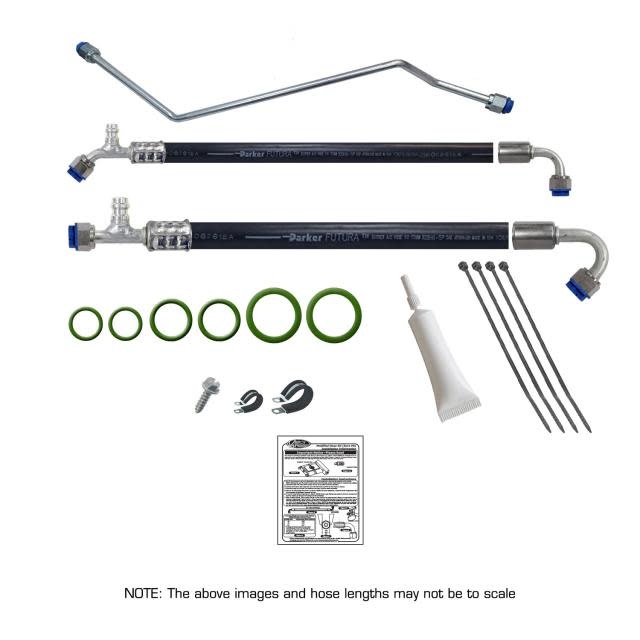 This modified hose kit is designed for use with a complete Gen IV SureFit™ system in vehicles without a stock engine compartment configuration and core support. The kit contains refrigerant hoses with pre-crimped beadlock fittings on (1) end with the other end open to accommodate a custom installation. All necessary fittings O-rings and mounting hardware are also included along with detailed installation and crimping instructions.