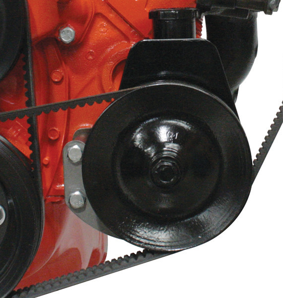 Big Block Low-Mount Power Steering Bracket Short Pump*. Chevrolet non-metric power steering pumps with attached reservoir on small or big block Chevy engines. Works with A/C and altenator brackets. Designed with built-in belt adjuster.