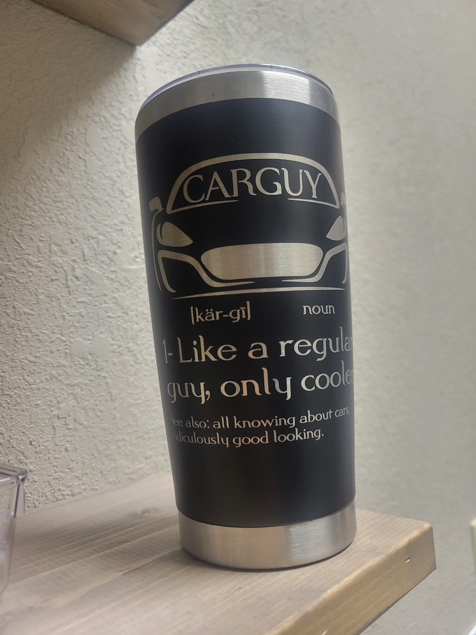 Stainless Steel Tumbler with Lid - Featuring the "Carguy - Like a Regular Guy, Only Cooler" Graphic