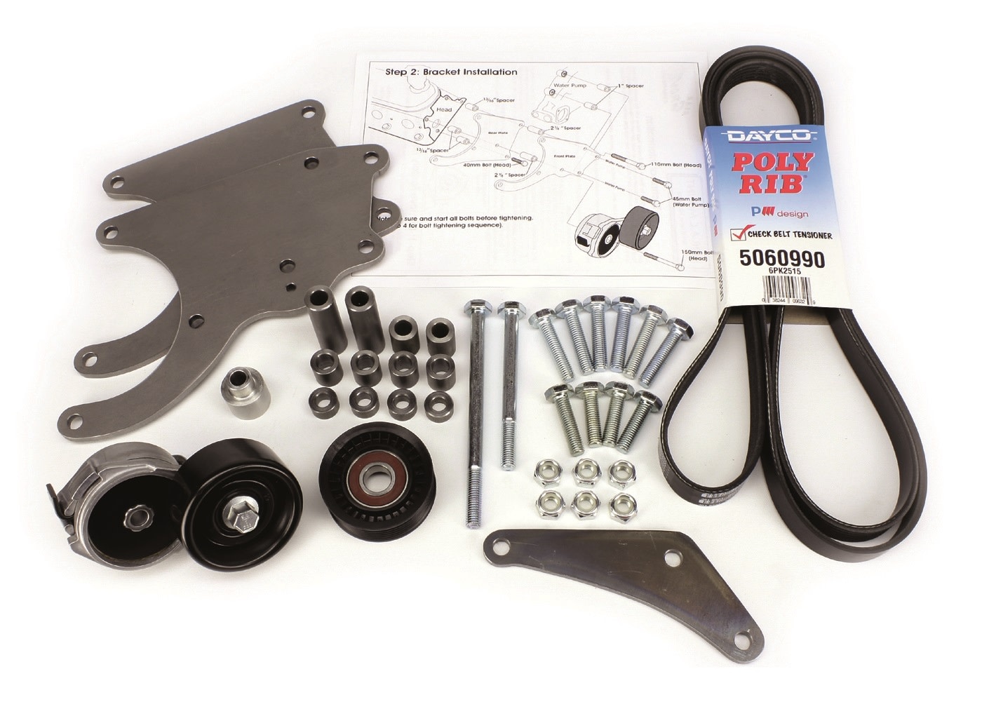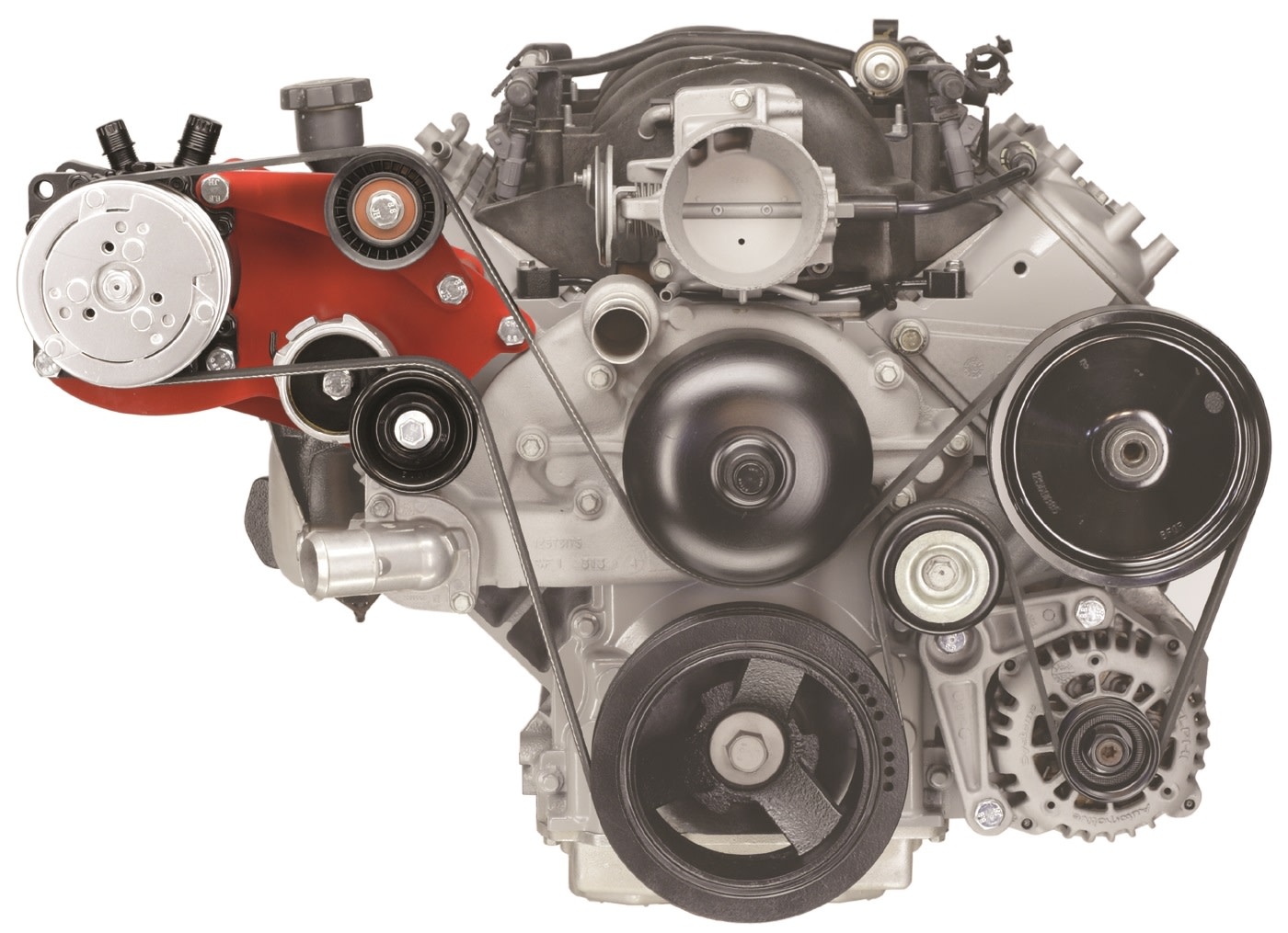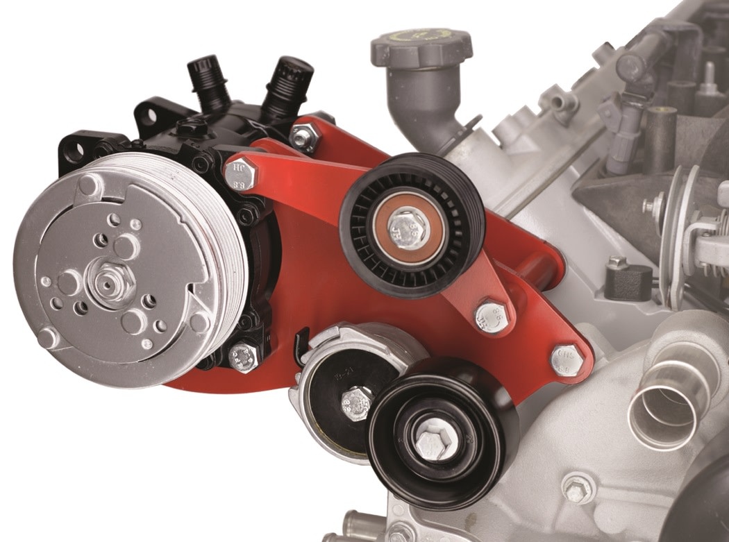 This bracket system is designed to mount an aftermarket Sanden A.C. compressor to the popular LS1 Camaro Firebird engines utilizing the factory alternator and power steering pump accessories. Bolts to head and water pump. Works well in vehicles with low hood clearance -- Trucks, 50-60’s cars, etc. Bracket kit includes: Steel A.C. mounting brackets, mounting hardware, idler bracket and pulley, heavy duty automatic belt tensioner, Dayco six-rib drive belt and illustrated instructions for easy installation.