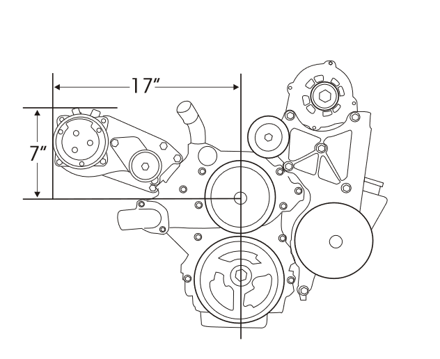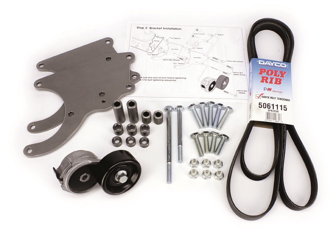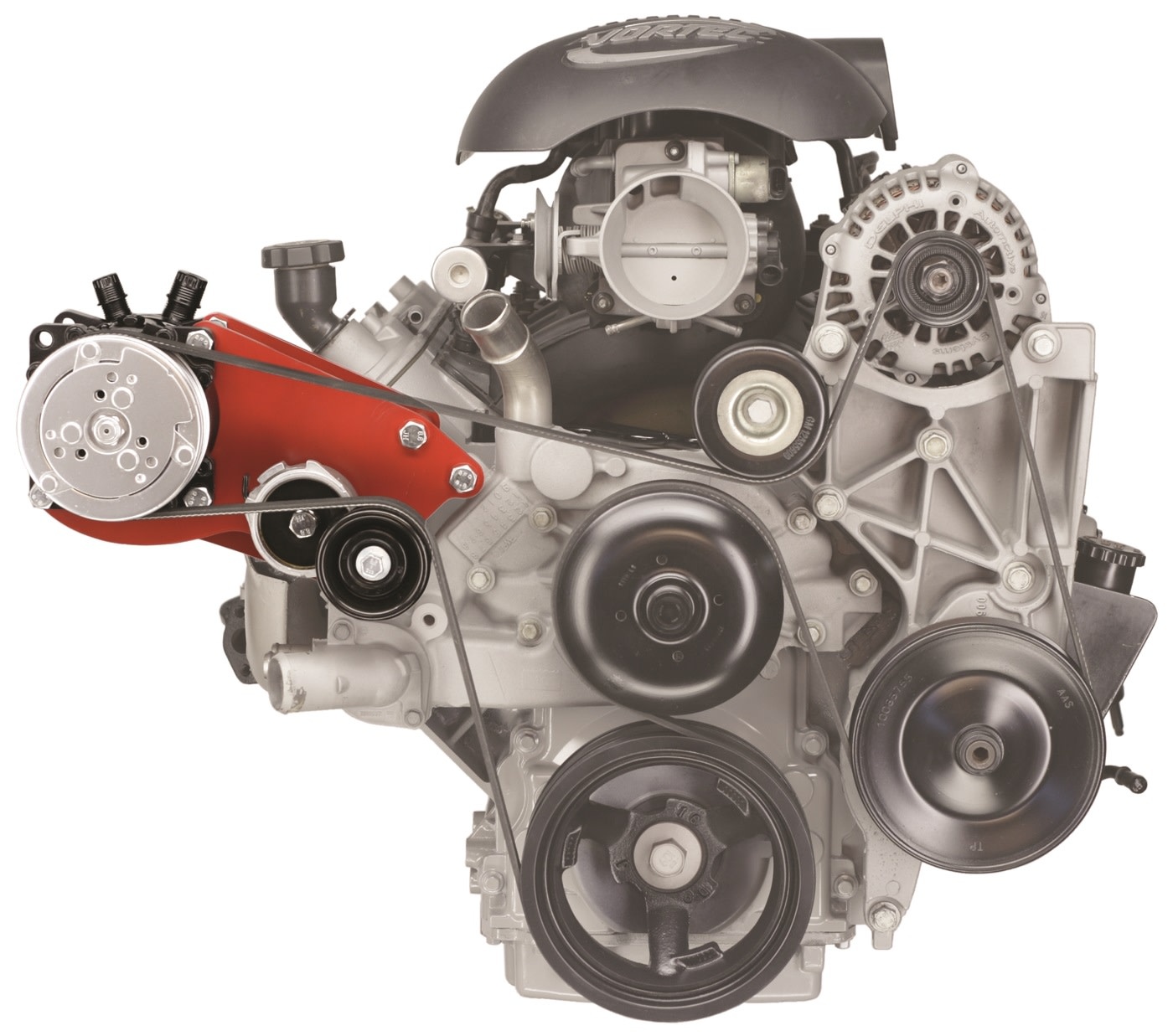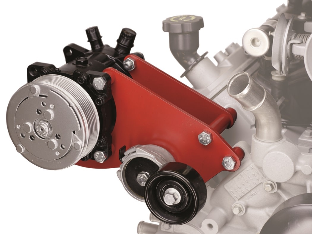 This bracket system is designed to mount an aftermarket Sanden A.C. compressor to the popular LS series truck engines utilizing the factory alternator and power steering pump accessories. Bolts to head and water pump. Works well in vehicles with low hood clearance -- Trucks, 50-60’s cars, etc. Bracket kit includes: Steel A.C. mounting brackets, mounting hardware, heavy duty automatic belt tensioner, Dayco six-rib drive belt and illustrated instructions for easy installation.