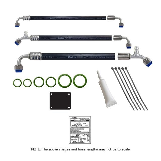 This modified hose kit is designed for use with a complete Gen IV SureFit™ system in vehicles without a stock engine compartment configuration and core support. The kit contains refrigerant hoses with pre-crimped beadlock fittings on (1) end with the other end open to accommodate a custom installation. All necessary fittings O-rings and mounting hardware are also included along with detailed installation and crimping instructions