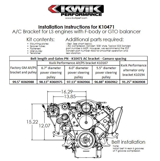 This bracket system is designed to install a Sanden compressor onto the original engine accessory drive GM LS series engines. Bracket kit includes a new tensioner.