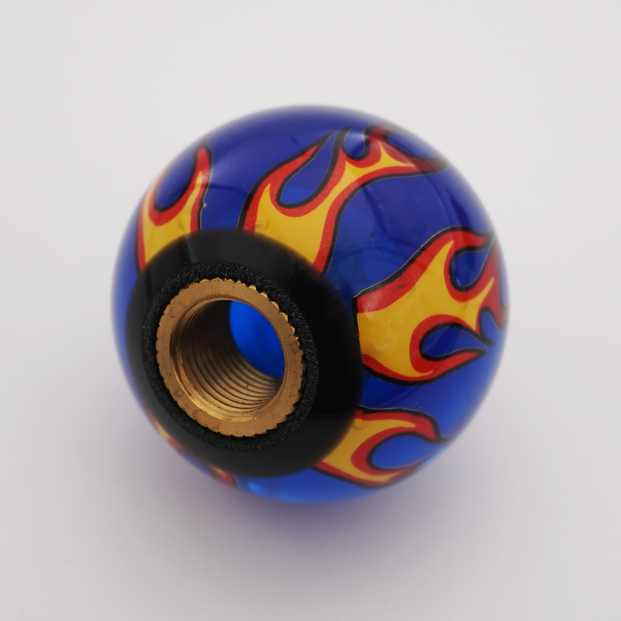 Flames on Blue Transparent Shift Knob - 2 1/8" knob with a 16mm x 1.50 brass insert
