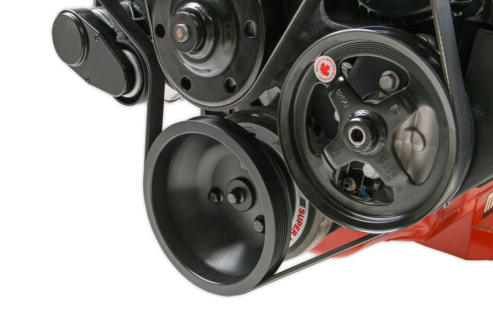 The Mid-Mount complete accessory system has all accessories pulled in tighter than other accessory drives. At the heart of the system is a "bracketless" design, where the accessories bolt directly to the water pump for a clean, integrated form. The design offers superb engine visibility to show off your horsepower, not your accessories. The Holley designed alternator is just as innovative. This premium alternator utilizes 6-phase technology as found on the C7 Corvette. The water pump also shares its design efficiencies with that of the C7 Corvette. The compact and reliable SD7 A/C compressor and Type II P/S pump with baffled reservoir are also integrated. The water pump design incorporates optional side or top heater ports. The top thermostat bypass and heater ports are recessed into the manifold. So if you don't need them, you don't see them! When we say "complete", we mean complete. The Mid-mount system comes with everything you need. All accessories are included, the water pump, A/C compressor, Alternator, and P/S pump with reservoir. All pulleys and the belt are supplied. Even A/C line adapter, heater hose adapters, power steering to -6 AN hardline, and the alternator plug/harness are included. Easy assembly was a priority during the entire development of this accessory solution. Color graphical instructions walk you through every step of the ultra-easy installation.