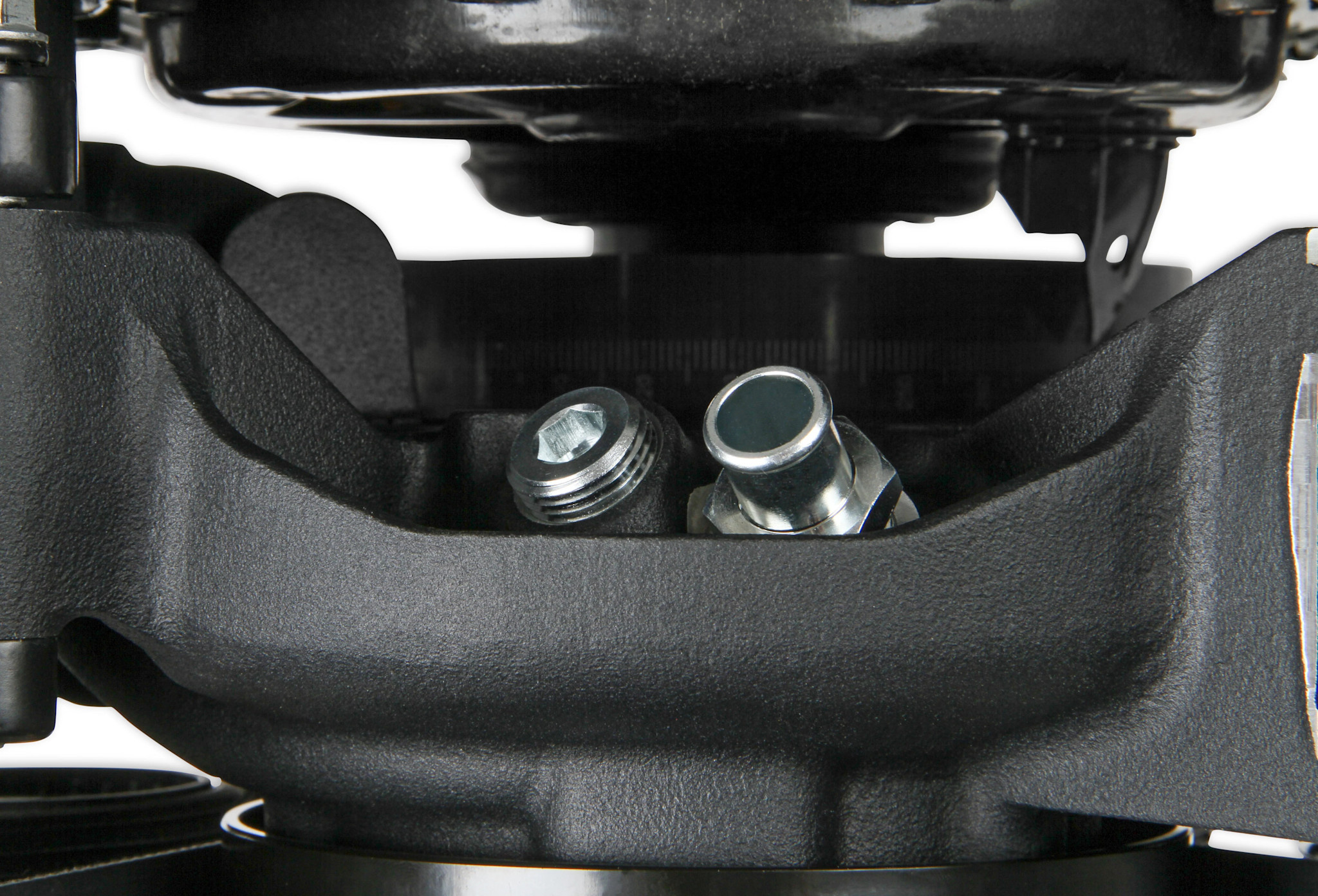 - Hidden thermostat bypass and heater hose ports with NPT line adapters included