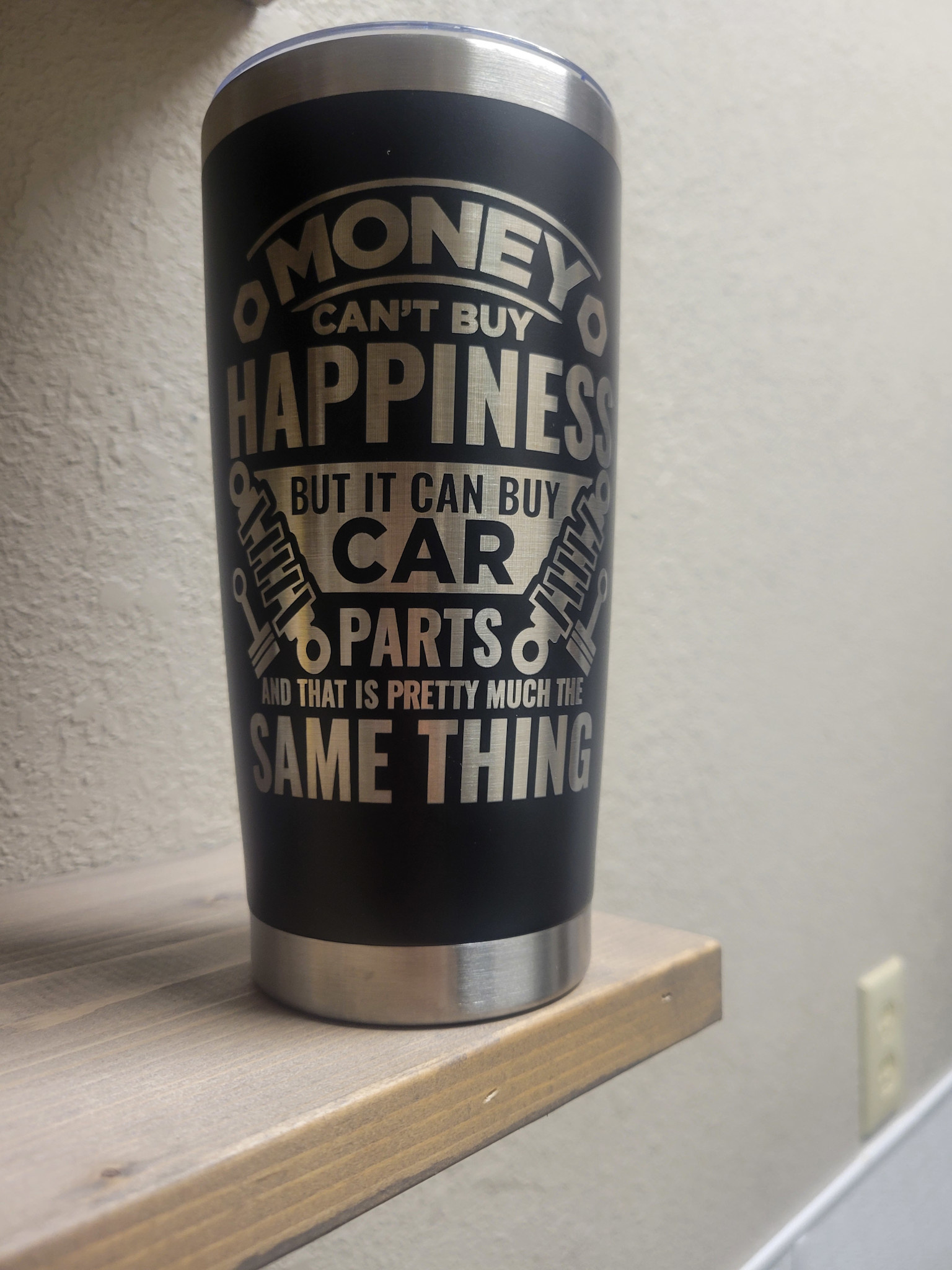 Stainless Steel Tumbler with Lid - Featuring the "Money Can't Buy Happiness, but it can buy Car Parts" graphic