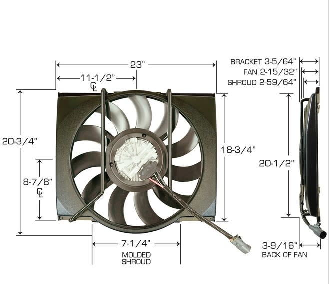 Brushless electric fan with custom shroud and powder coated tubular mounting bracket (see diagram for dimensions and clearance requirements). Mount vertically or horizontally. Includes heavy-duty 6-gauge power harness wiring kit 231088 (as shown) with 80 amp MIDI-fuse assembly.