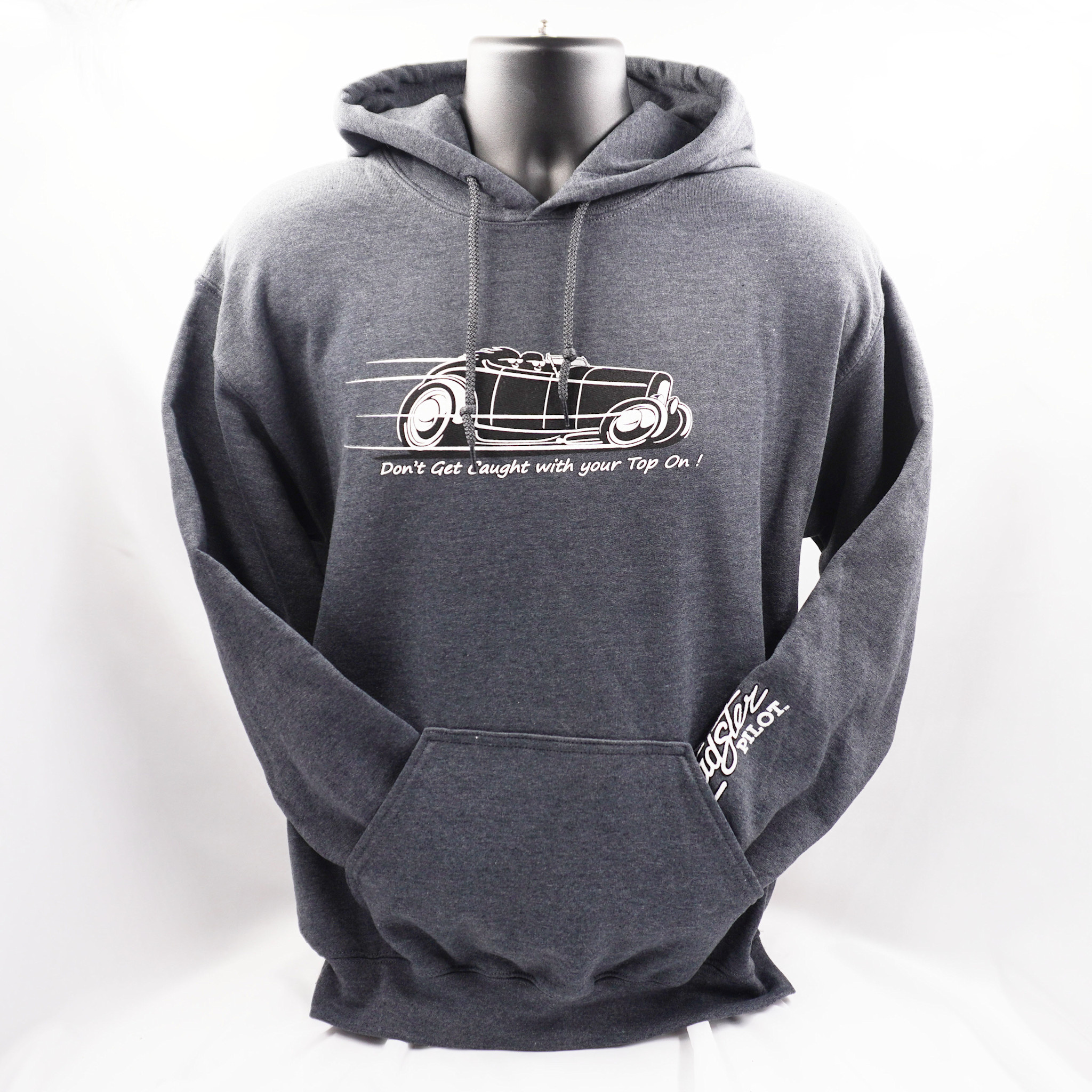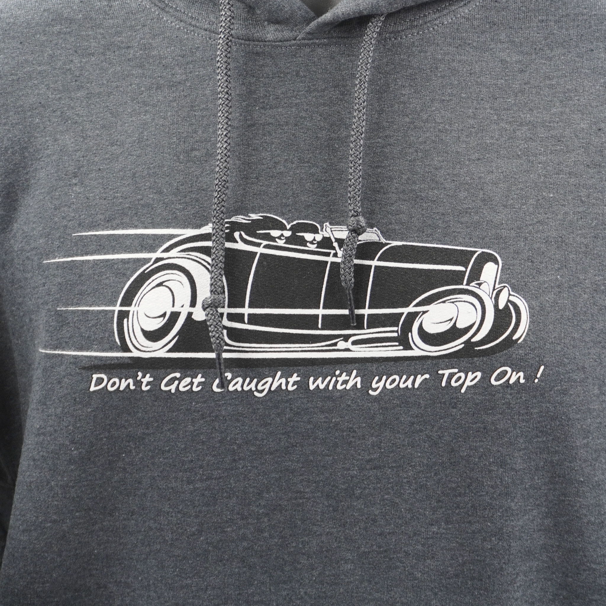 This "Don't Get Caught With Your Top On" hoodie will keep you warm as you cruise with your roadster top off!