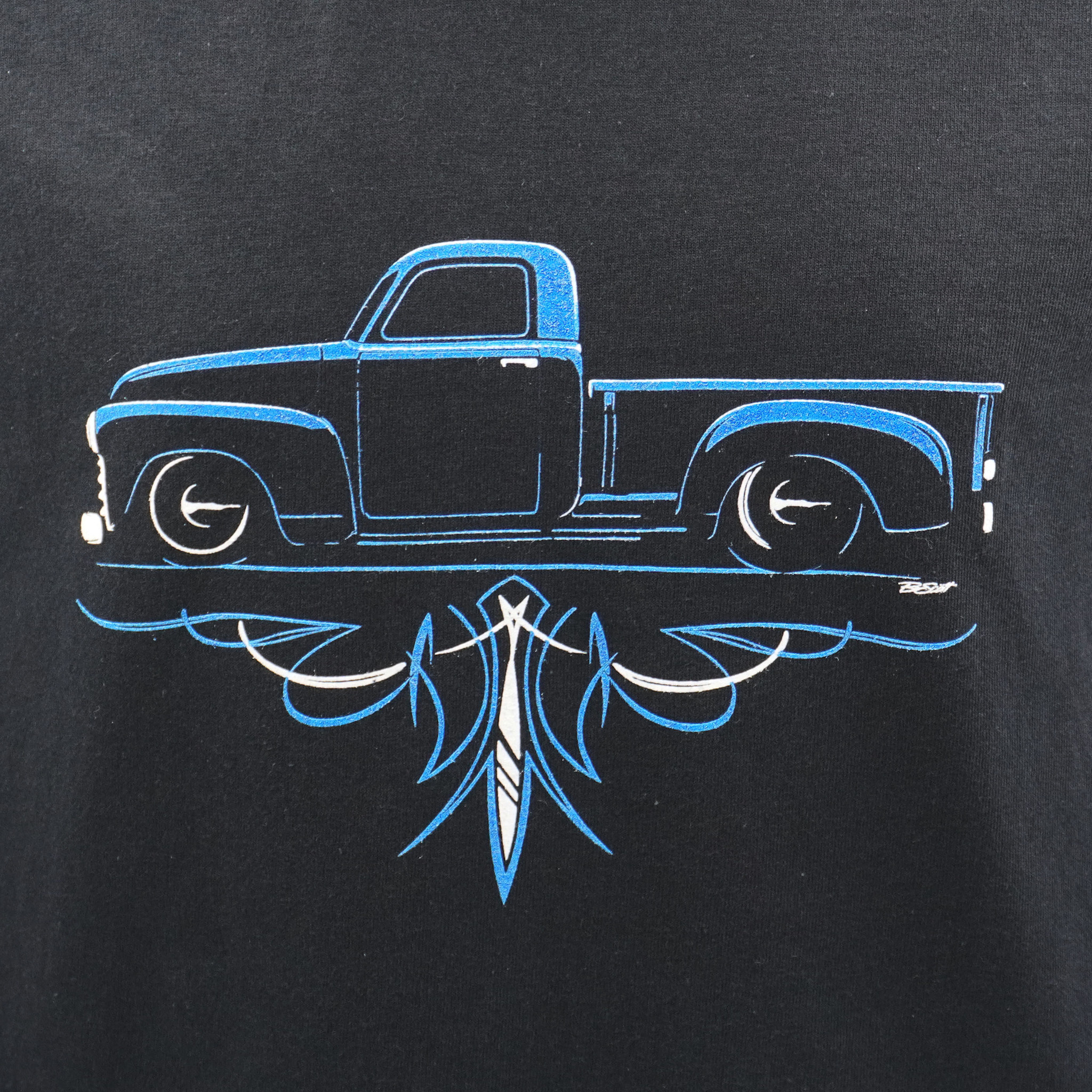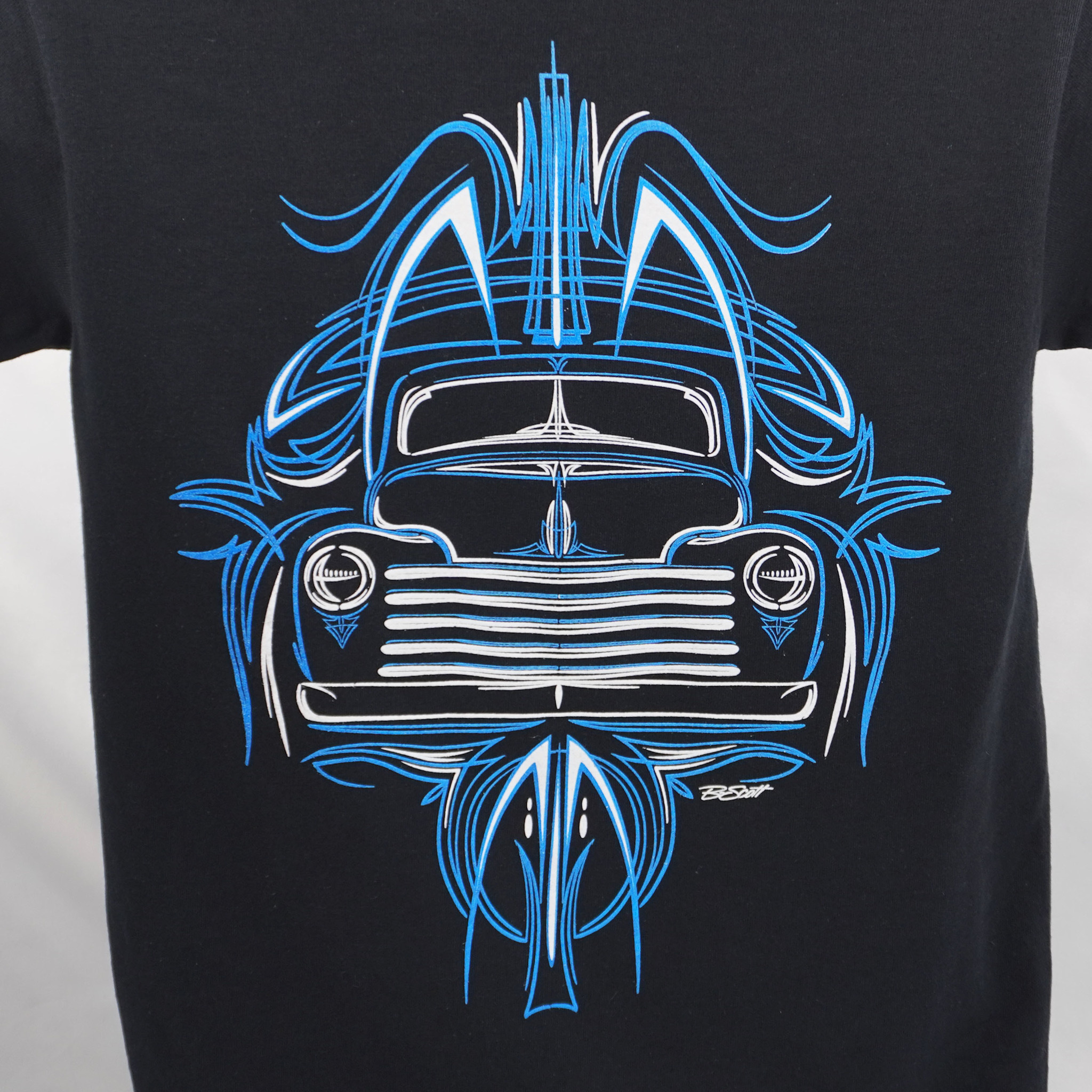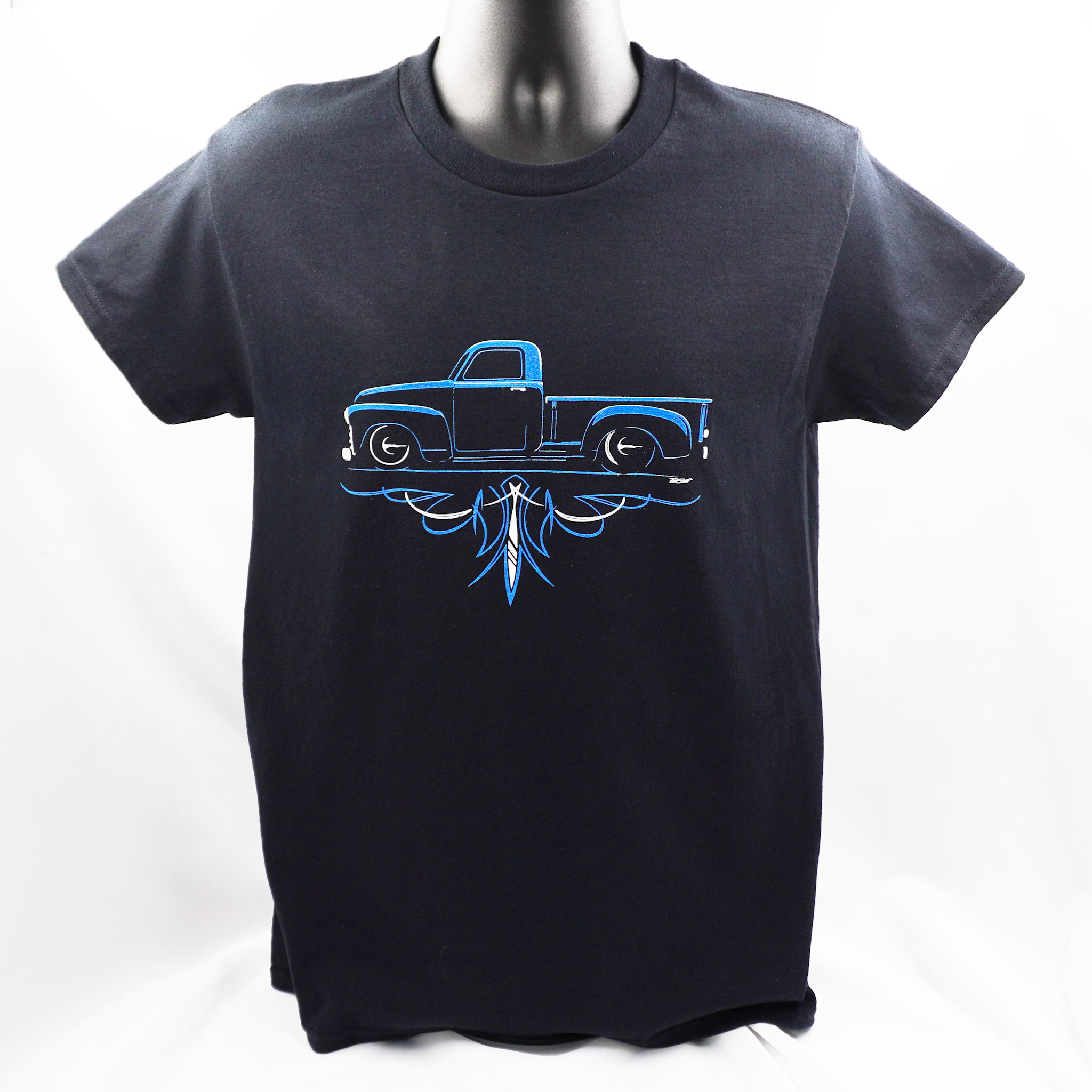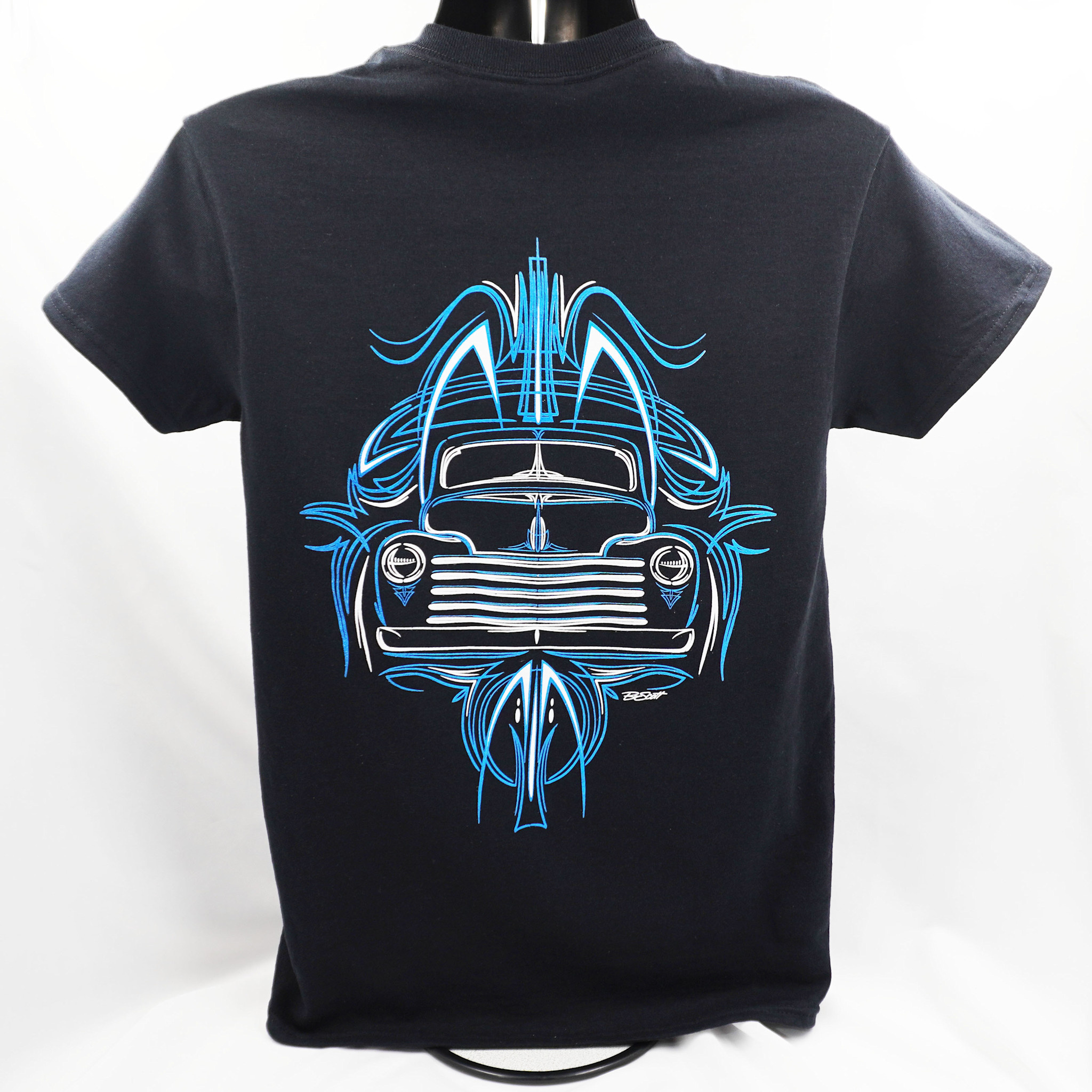 Whether you like pinstriping, Chevy trucks, or just a cool design, this t-shirt is for you! Blue and cream pinstriping with the side view of the truck on the front and the front view of the truck on the back.