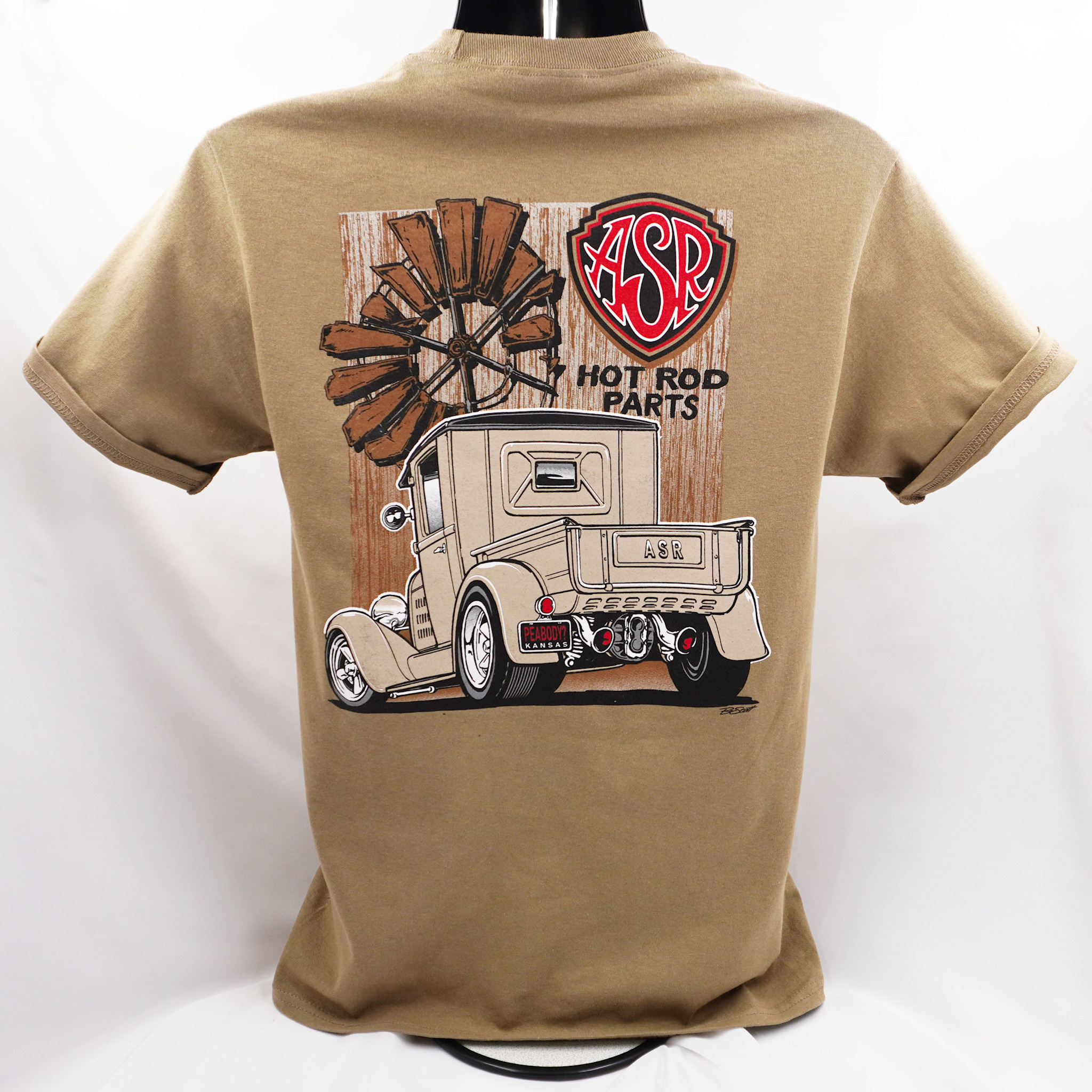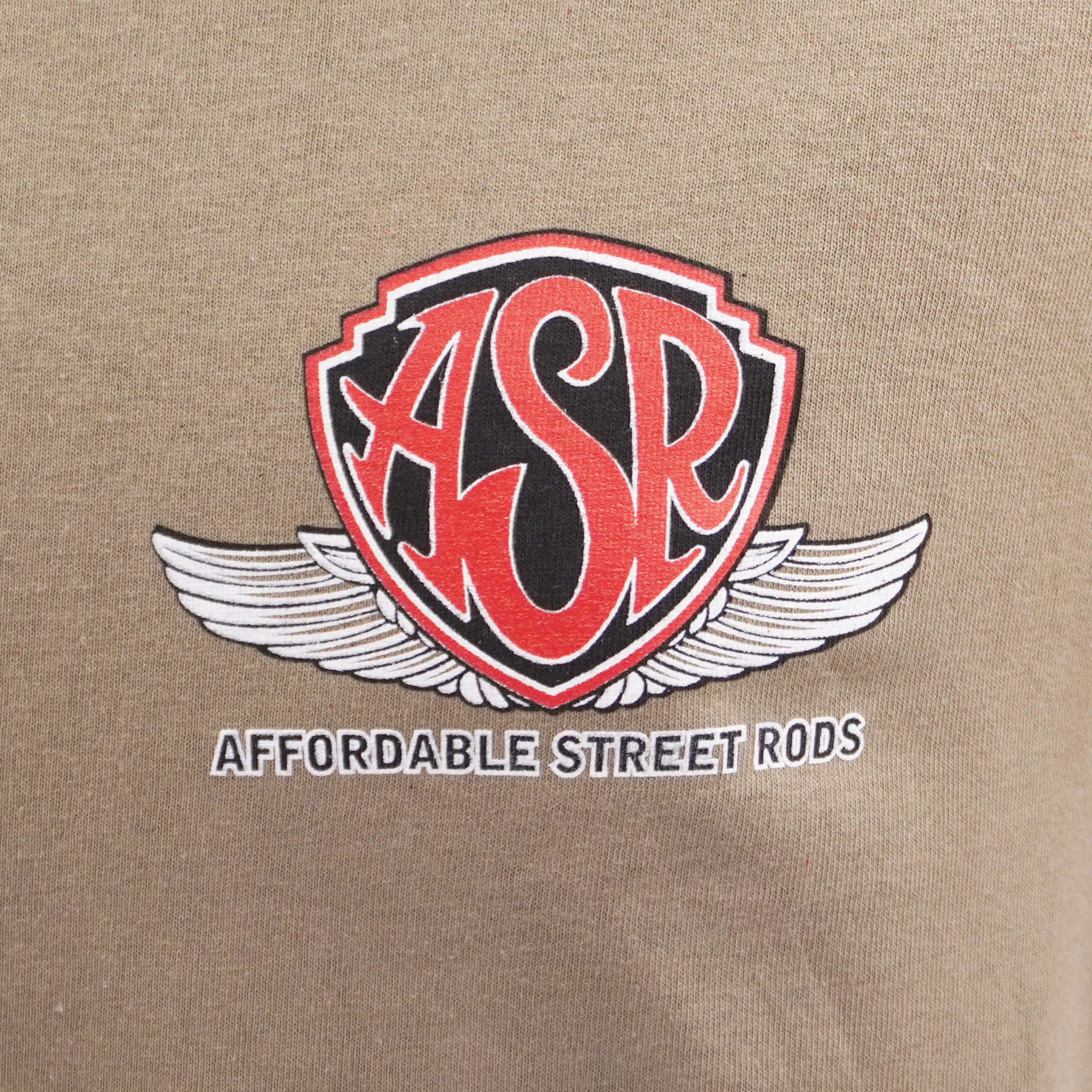 Affordable Street Rods' newest graphic is printed on the back of a natural color t-shirt, and features our nostalgia logo on the front center.