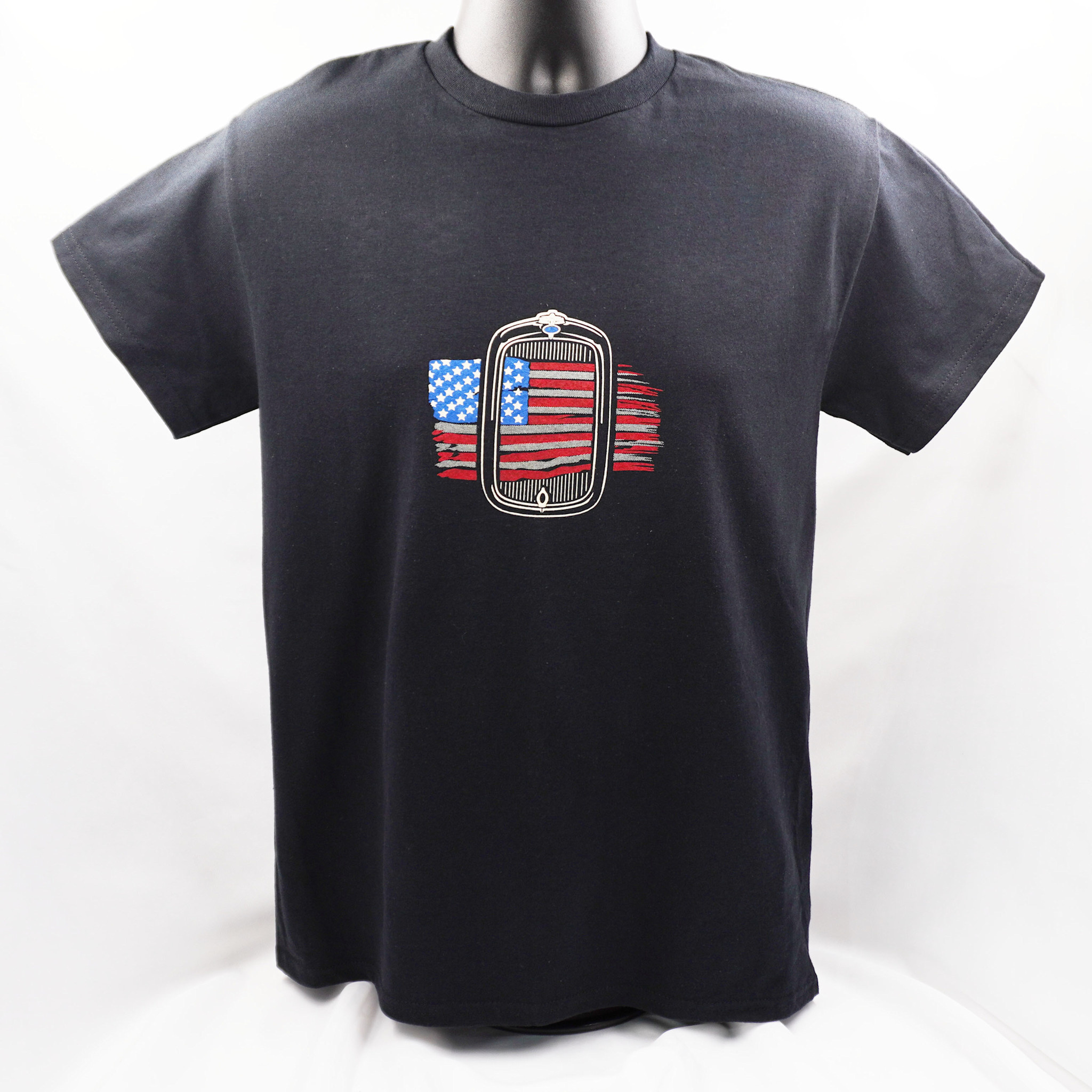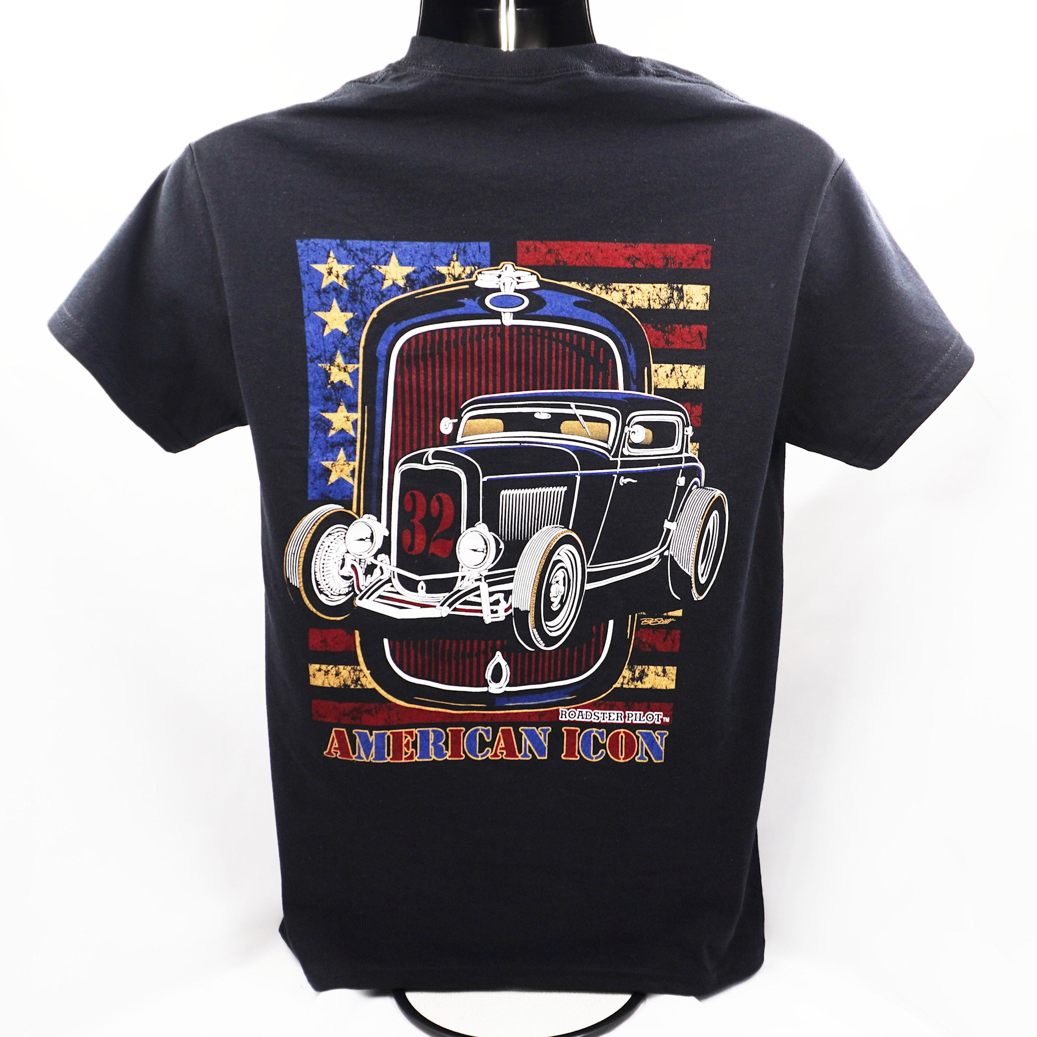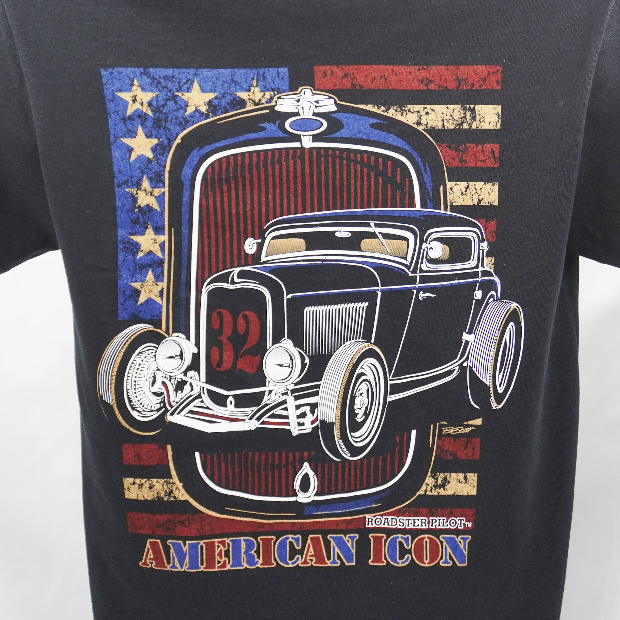 Show your American pride with this black tee. A large graphic of the American flag and America's iconic hot rod - '32 Ford is printed on the black. A small graphic is printed on the left, front chest area.