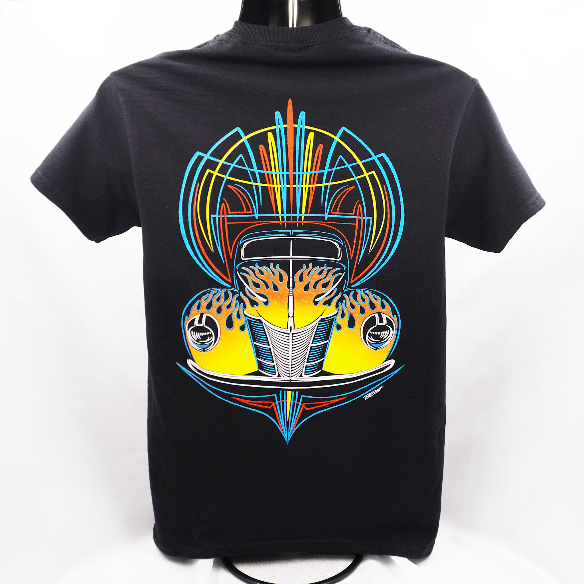 Color: Black T-shirt w/Mulit-Colored & Cream Pinstriping