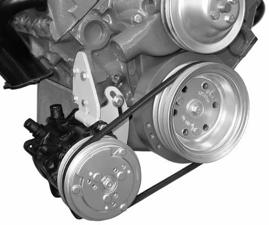 Small Block Low-Mount Compressor Bracket Short Pump. Bolts to fuel pump mounting flange. May be driven off crank and fan pulleys or crank pulley only. Requires use of remote fuel pump.