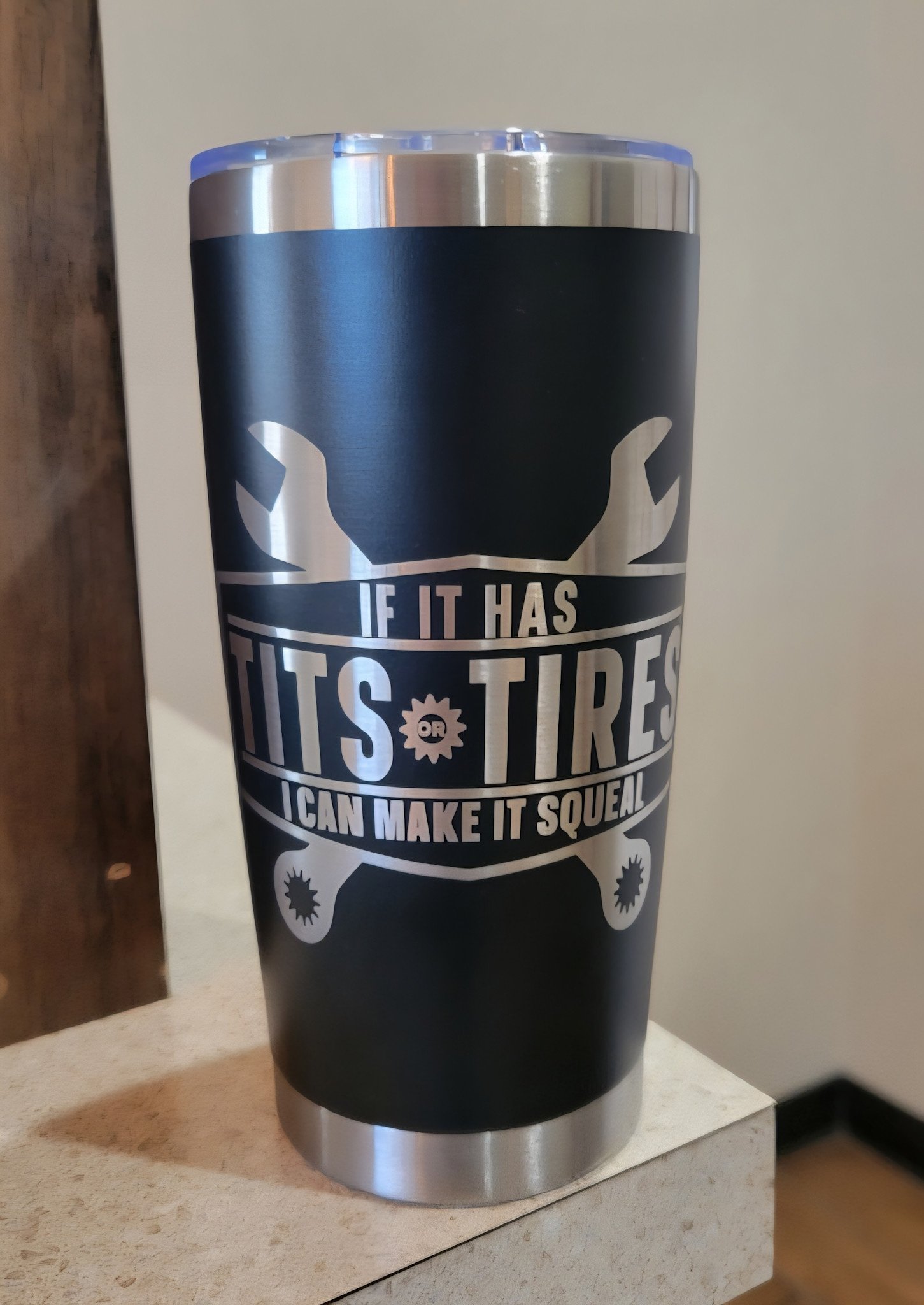 Featuring the bold and cheeky "If It Has Tits or Tires I Can Make It Squeal" graphic, this tumbler brings personality to your drinkware collection and makes a fun gift for gearheads, hot rodderts, and anyone with a sense of humor. Perfect for coffee, water, tea, or your favorite beverage.